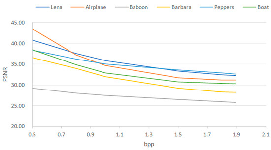 To further demonstrate the competitive performance of our proposed HP-AMBTC-based DH scheme in Table 2, we compare our scheme with six other existing BTC or AMBTC-based data hiding schemes [15,16,17,18,19,20]. It is noted that all data of the other six schemes are cited from the original experimental data presented by the original research teams. Based on the data presented in Table 2, it is obvious that the average maximum hiding capacity of the test images delivered by the proposed scheme is 1.90 bpp, which is relatively higher than that offered by the other six data-hiding schemes. Our scheme embeds data into the high mean values or the low mean values derived from AMBTC. The maximum change to the mean value is within the range [−2, 3], which means that we can embed 1.9 bpp with an embedding efficiency of almost 2 bits per change. Moreover, there are differences between the original pixel value and the mean value. Embedding data to the mean value makes it possible to get close to the original pixel value, which greatly decreases the embedding distortions; this means that the stego pixel value is nearly the same as the original pixel value. As shown in Figure 5, our scheme achieves the highest average hiding capacity while maintaining better image quality at 32.26 dB. However, a lookup table is required for data hiding and extraction in our scheme; either the corresponding data hiding rules or data extraction rules can be easily programmed to replace the lookup table.