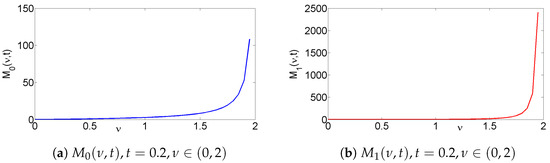 The zeroth moment depends on t, , and , but the first moment depends on t, , , and k. The moment functions and are both decreasing as time t increases, moreover the values of approach 0 as t approaches ∞, which demonstrates the average total number and total volume of particles are decreasing as t increases. Figure 1 interprets the moments and are both increasing for case , as changes from 0 to 2 at time . Figure 2 shows the evolution of dynamic behavior for solution (26) with and for case . Figure 3 interprets the evolution of dynamic behavior for solution (26) with and for case , when changes from 0 to 2.