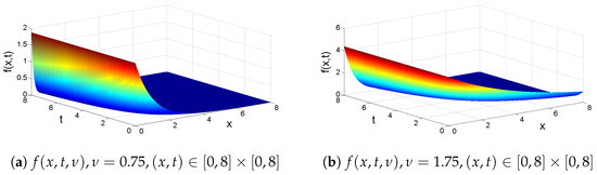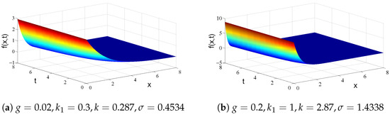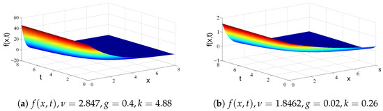Evolution of dynamic behavior for explicit exact solutions (27) are considered as follows. Since parameters and can be positive or negative, if the values of are positive, which is a physical solution, if the values of are negative, which is an unphysical solution. In terms of , the values of tend to get closer and closer to 0 as t or x get closer and closer to ∞, which shows solutions (27) are asymptotically stable and have a property that population density vanishes for infinite sized particles. If , then the moments and decrease as t increases, which demonstrates the average total number and total volume of particles become less and less as t becomes more and more. Finally, they approach 0 as time t sufficiently approaches ∞. Figure 4 shows evolution of dynamic behavior of solution (27) with kinetic parameters (30) and for and .