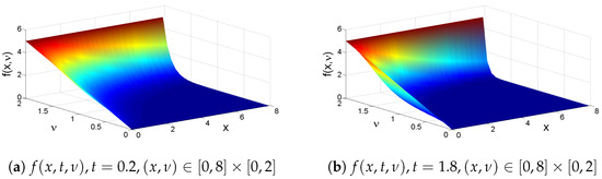 an approximate value of is 3.0689825. The values of approach 0 as t or x sufficiently approaches ∞, which shows the obtained solutions (35) and (36) to Equation (9) with are asymptotically stable, and have a property that population density vanishes for infinite-sized particles. The computed results of the moments and for solutions (35) and (36), demonstrate the average total number and total volume of particles are decreasing as t increases. Figure 5 shows evolution of dynamic behavior of solution (36) with and for and .