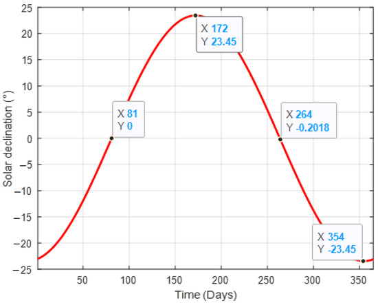 Solar declination stands for the angle between the Sun’s direction and its projection on an equatorial plane [7,13,16]; it is calculated using Equation (1):