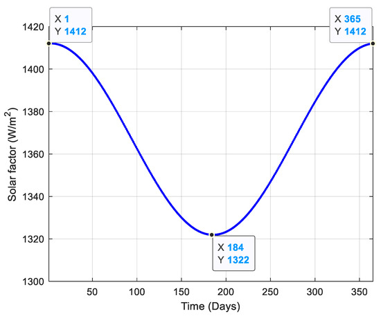 As shown in Figure 2, a symmetrical behavior of the solar factor value is noticed around , which corresponds to 3 July where the Earth–Sun distance is at its maximum.