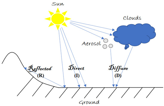 Solar radiation incident on a horizontal or inclined surface is divided into three components: a direct component (I), which travels unobstructed from the sun to the ground; a diffuse component (D), scattered by various atmospheric elements such as clouds, aerosols, and dust; and lastly, a component reflected by the ground surface, which is typically negligible (R). Collectively, these three components constitute the global radiation (G).