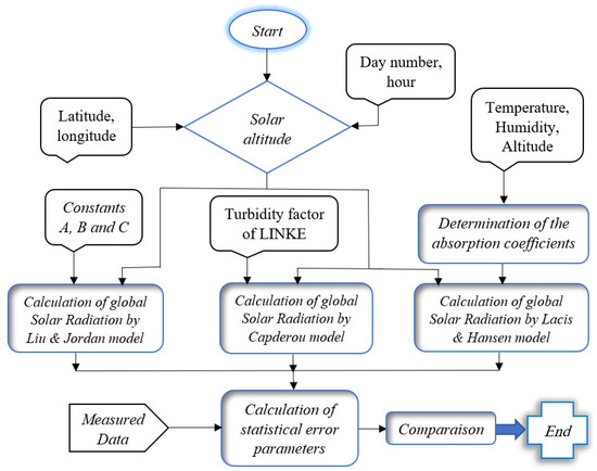 In our initial step, we input the latitude and longitude of the site, along with the day number of the year and the time loop (ranging from 1 to 24 h). This information is pivotal for computing the solar altitude, a parameter universally applied in all models. Subsequently, in the calculation of global solar radiation at ground level, additional inputs such as temperature and humidity are required for the Lacis and Hansen model, the turbidity factor of LINKE for the Capderou model, and constants characterizing the state of the sky for the Liu and Jordan model. Finally, a comparison between the measured and estimate values is obtained by calculation of statistical error parameters to determinate the best model.