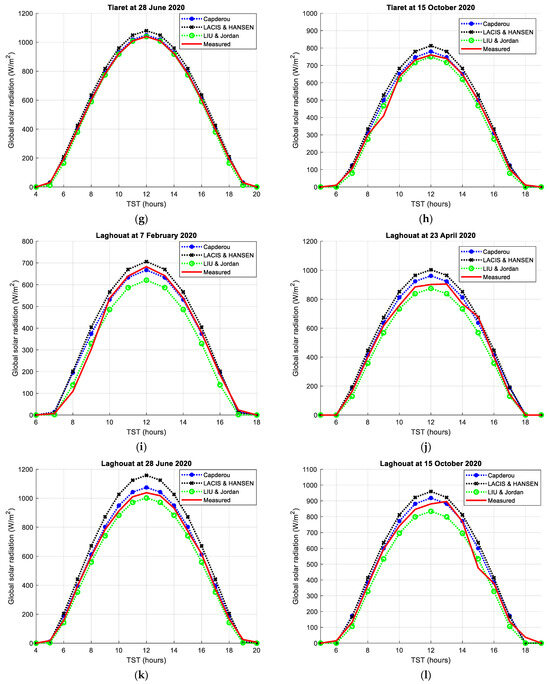 Moreover, the symmetrical behavior observed in Figure 7a,c,k,o around noon underscores the inherent symmetry prevalent in natural phenomena. In contrast, the unsymmetrical behavior seen in the measured data in Figure 7e,m can be explained by the presence of clouds during specific time intervals. Cloud cover during the period from 9 a.m. to 14 p.m. on 7 February in Tiaret and from 9 a.m. to 12 p.m. on the same day in Tamanrasset reduces the intensity of global radiation reaching the ground.