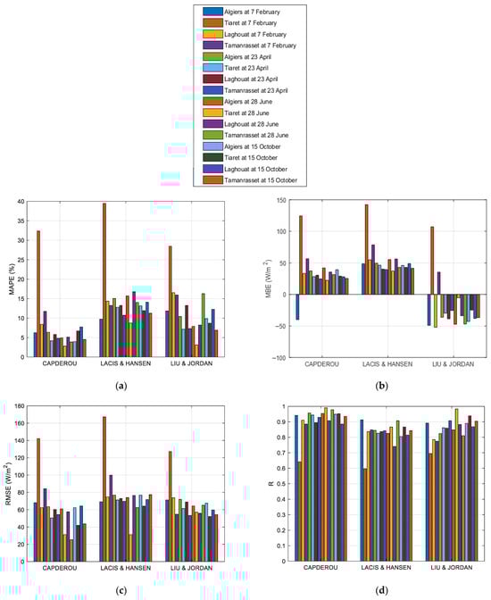Statistical errors for all studied models [17,23,25,31,33,34]: (a) MAPE; (b) MBE; (c) RMSE; (d) R.