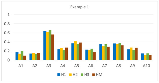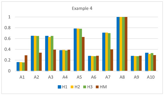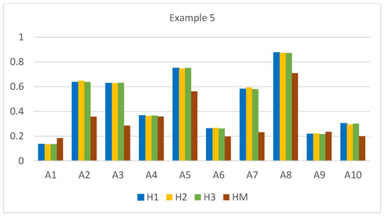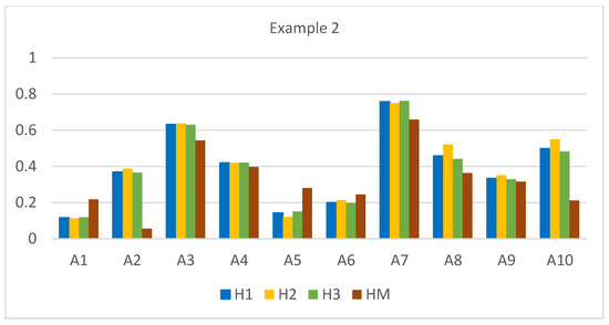 Note that Hellwig’s approach, neglecting the interaction between criteria, results in an overestimation of the values for the top-scoring alternatives A3, A7, A8, and A10 while comparing with the HM measure. Conversely, it exhibits an opposite deviation for the low-scoring alternatives A1 and A5.