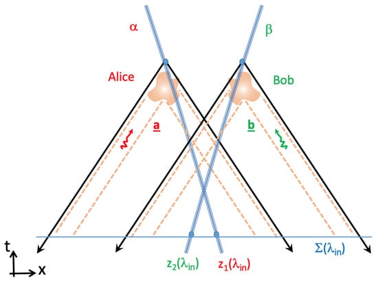 The two Equations (2) and (3) are not controversial and are associated with the notion of local causality already advocated by Einstein. The idea is that, by assuming that observers Alice and Bob in regions A and B are choosing ‘freely’ at the last moments the setting directions and , it must (according to the principle of Einstein’s special relativity) be impossible to have faster-than-light (tachyonic) propagation of any physical influence from A to B or B to A affecting the ‘independent’ measurements. The measurements performed by Alice and Bob must therefore only depend on the local properties or and on the shared hidden variable associated with the ‘preparation at the source’ (common past) of the two entangled particles. The last Equation (4) is even more obvious and natural and states that the hidden variables prepared at the source S must be independent of the settings and because the choice was made freely at the last moment after the preparation of the entangled pair at the source. Relaxing this statistical independence assumption would a priori lead to a superdeterministic and conspiratorial Universe that seems to conflict with the goal and methodology of science.