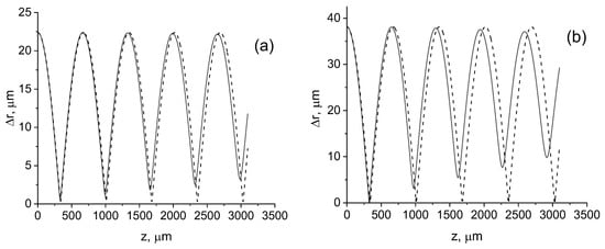 The effects of nonparaxiality are most evident when the beam is being focused. Nonparaxial effects significantly affect the characteristics of a tightly focused beam [,,,]. In the paraxial approximation, focusing occurs periodically with a period . The first plane of focus is located at a distance . However, the focusing begins to weaken with increasing distance if nonparaxial effects are considered (Figure 1). In addition, there is a shift in focus plane towards the source aperture, and this shift accumulates with distance and increases with increasing aperture size . Unlike the paraxial case, focusing ceases to be observed with increasing distance; i.e., the properties of self-imaging will decrease at a certain distance, determined by the degree of nonparaxiality .