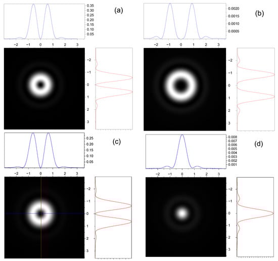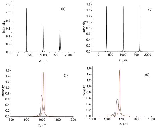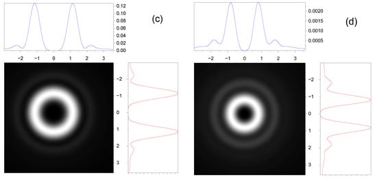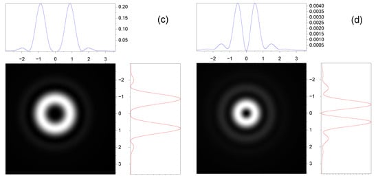In Figure 2, the intensity distributions in the axial direction of the transverse field component are presented for nonparaxial and paraxial cases. The intensity distributions in the longitudinal direction at different distances are determined by the function . It follows from the simulation that intensity oscillations in front of the focusing plane occur due to interference between modes. In addition, a focal plane shift occurs when the nonparaxiality effects are considered (Figure 2c,d). This shift increases with the aperture of the incident beam and the degree of nonparaxiality.