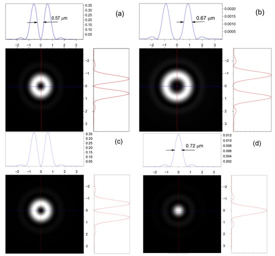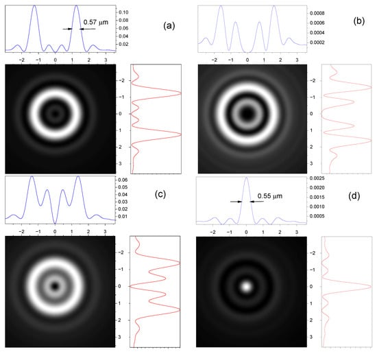 It can be seen that the ring size in Figure 7a is much larger than the ring size in Figure 3a, although both cases have the same total angular momentum . The transverse components have an annular shape, whereas the longitudinal component of the left-handed polarization has a Gaussian shape (Figure 7d). Note that the spot size of the longitudinal field component in the plane of focus is less than the wavelength. The FWHM (full width at half maximum) value of the focused spot in the longitudinal component of the field is only 0.55 µm (Figure 7d). The thickness of the ring is also less than the wavelength (Figure 7a).