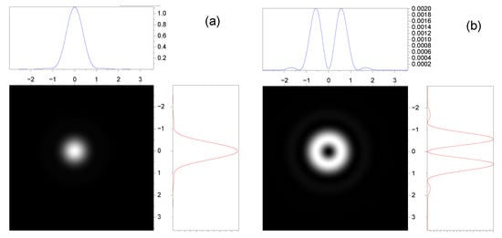 In Figure 5, the intensity profiles of the transverse and longitudinal field components in a focal plane are presented for the incident beams with the right- and left-handed polarizations and different topological charges. The total angular momentum of both incident beams , and the radial index p = 0.