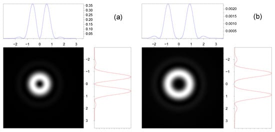 In Figure 7, the intensity profiles of the transverse and longitudinal field components in a focal plane are presented for the incident beams with the right- and left-handed polarizations, the radial index , and the same topological charges .
