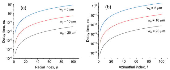 It can be seen that the delay time increases with increasing radial and azimuthal indices. The delay time also increases with a decrease in the radius of the fundamental mode . For high-order azimuthal modes and topological charge, a delay time can be observed compared to the fundamental mode of the order of 10 ns/km. Note that the number of propagating modes is given by where [,]. Graded-index fibers with a core diameter of 62.5 µm and a numerical aperture of NA = 0.275 support several hundred propagating modes.