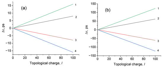 Relative delay times as a function of topological charge: z = 1 km, ; 1—delay between beams with σ = −1 and σ = 1, ; 2—; 3—; 4—. (a) µm−1; (b) µm−1. Subindex in corresponds to the spin angular momentum σ = 0, 1. −1.
