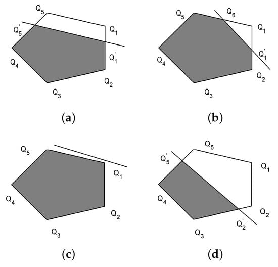 The process of the IC estimator at time k, the polygon v indicates the possible candidate regions of unknown parameters at the previous moment. The straight line comes from the information at step k; it splits v into two sub-polygons, the left-hand one of which will become the new polygon . Four typical situations of IC estimator are shown in subfigures (a), (b), (c) and (d), respectively.
