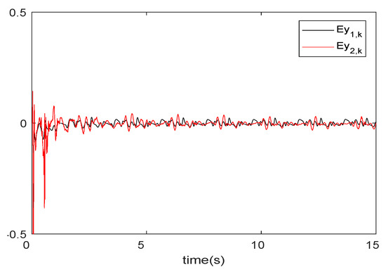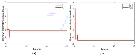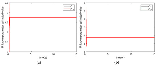 For ReOS-ELM, these parameters are: the number of hidden nodes of ReOS-ELM is , , the activation function of ReOS-ELM is sigmoid, , and . The main results, which include the estimated values of by the improved IC estimator and the tracking error, are depicted in Figure 3 and Figure 4. The curves in Figure 3a,b show the change trends and and estimated values of and , respectively. The tracking curves and tracking error are shown in Figure 4a and Figure 4b, respectively. The estimated values shown in Figure 3 show that the values of estimated by the improved IC effectively approach the actual value, and the small tracking error in Figure 4b also indicates its effective performance in estimating the unknown parameters.