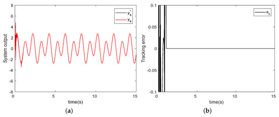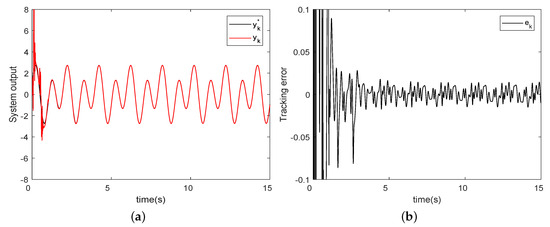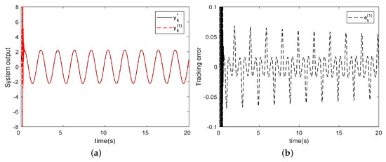 The performance of the control system in the first simulation example. (a) and (b) show the tracking curves and error curve, respectively.