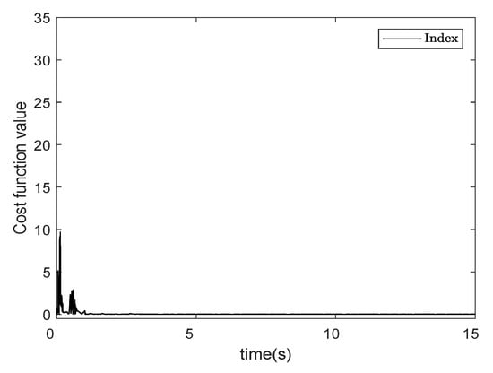 Figure 5, Figure 6, Figure 7 and Figure 8 are the second simulation’s example results. Figure 5 plots the change curves of the estimated values and . In Figure 6, the curves denote the simulation experimental results of the control algorithm based on the proposed IC estimator and ReOS-ELM, and Figure 6a and Figure 6b show the tracking curves and error curve, respectively. The curve in Figure 7 indicates the change trend of the cost function, Equation (62), which diminishes through time. In Figure 8, the curves denote the simulation experimental results of MFAC based on RLS, and the curves in Figure 8a and Figure 8b show the output signal and error signal, respectively. The change trends of Figure 6b and Figure 8b show that when this system reaches a stable state, the maximum error in the control algorithm based on the proposed IC estimator and ReOS-ELM is 0.0152, the maximum error in MFAC based on RLS is 0.0596. This result indicates that the performance of the proposed algorithm is better than the performance of the MFAC based on RLS. The change curves in Figure 5 show that the final estimated values and have some degree of deviation from the values and , and it indicates that the semi-parametric model is established depending on the historical data and is different from mechanism models.