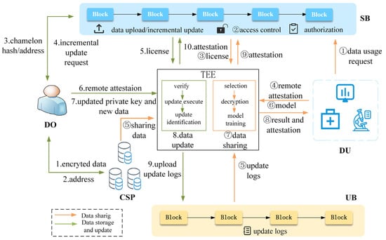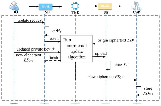 During the incremental update process, DO submits a data update request to the smart contract within the SB (Step 4). After authentication, the SB initiates an off-chain execution license to the TEE (Step 5). DO establishes remote attestation with the TEE and transmits the updated private key and new ciphertext to the TEE (Steps 6–7). The TEE executes the data incremental update algorithm and generates the update identification (Step 8). Upon completion of the update, the TEE reports the status back to the SB and uploads the update log to the UB (Step 9).