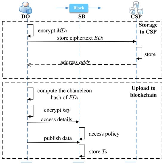 DO encrypts his case data to be shared, stores the ciphertext in the CSP, and obtains the storage address (steps 1–2). Next, DO computes the chameleon hash of the ciphertext and releases the chameleon hash digest, address, and other necessary information to the SB. Meanwhile, the data access and sales rules are uploaded to the access control smart contract to generate the access policy (step 3).