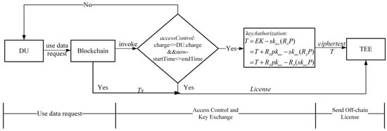 TEE picks the random number and computes as the public key. Thus, the public–private key pair of TEE is (, ). Then, TEE executes the initialization algorithm to deploy the data update, data validation, and data computation program code. TEE encrypts the license information and sends it to the smart contract of SB. The is an identifier for TEE to verify whether the smart contract license is legal or not.