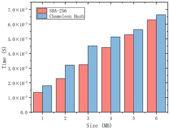 Experiments were conducted to compare the computation time of chameleon hash and SHA-256 for different data sizes. Implementation of the RSA-based chameleon hash algorithm and SHA-256 algorithm was executed using basic library functions of C language. We implemented the RSA-based chameleon hash and SHA-256 using the basic library functions of C language. Afterward, a test was conducted using 1–6 MB data to calculate the time overhead of chameleon hash and SHA-256 values respectively. Reading the data in chunks and then merging the calculation, 1000 tests were conducted to find the average value, and the results are shown in Figure 5. Based on the experimental data, it is observed that the calculation overhead for chameleon hash values for the same data size is slightly higher than that of SHA-256. However, the time overhead is still within feasible limits for the users. It should be noted that the time difference between the two decreases gradually as the size of the data increases. We suspect that this is due to the increasing time overhead of reading data, which is becoming a substantial portion of the computation time overhead.