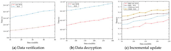 First, we conducted tests to measure the time overhead of the data validation and calculation algorithm for data ranging from 50 to 300 KB in both the SGX and non-SGX environments. The experimental results are presented in Figure 6a. Analysis of the results indicates that the time overhead for data validation in the SGX environment is approximately higher than that in the non-SGX environment. Secondly, we compared the decryption time of data in SGX and non-SGX environments for ciphertexts ranging from 10 to 50 KB. The experimental results are shown in Figure 6b. The results indicate that the time overhead of decrypting ciphertexts with the same data size is approximately more in SGX than non-SGX environments on average. Finally, we conducted tests on incremental updating data and measured the time consumption with various original data sizes. We used 50 KB and 150 KB as new data, and according to the experimental results shown in Figure 6c, it was determined that the overhead for updating data is positively correlated with the size of the data. In addition, the execution time in the SGX environment was about 0.1 s slower on average than the execution time in the non-SGX environment.
