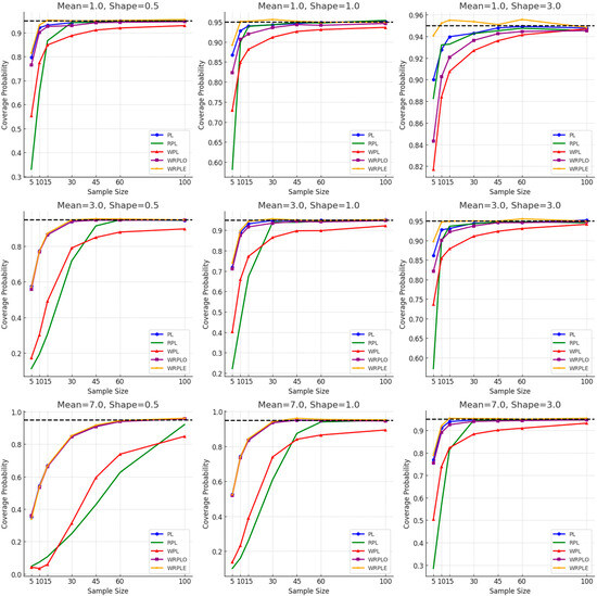 Figure 2 shows the performance of the proposed intervals WRPLE and WPL compared with the existing intervals PL, RPL, and WRPLO. The WRPLE method demonstrates high CP across various sample sizes and distribution parameters, making it a strong contender. Interestingly, the PL method also shows robust performance, particularly in certain conditions, potentially ranking as the second best in terms of CP. For instance, with a mean of 3 and a shape parameter of 0.5 at a sample size of 15, PL achieves a CP of around 0.92, notably higher than WPL. This highlights PL’s effectiveness under specific parameter configurations.