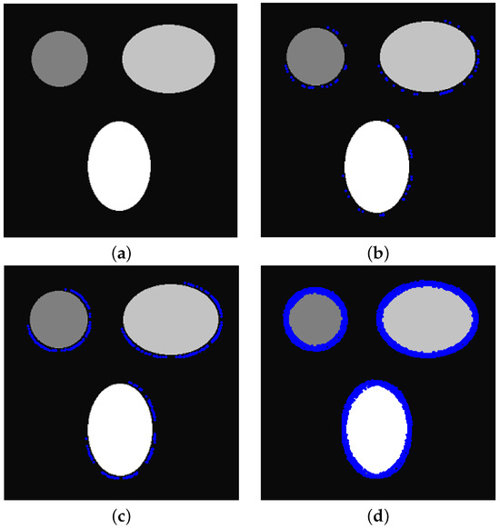 In the first set of experiments, we artificially synthesized an image containing regions with diverse features, as shown in Figure 8a. By setting the sliding-window parameter (w) to 7 and performing edge segmentation based on the local Hurst exponent (), we successively adjusted the constraint parameters ( to , , and ), resulting in the segmented regions depicted in Figure 8b–d, respectively.