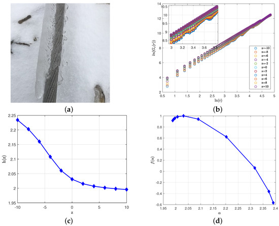First, we performed multifractal analysis on the icing image shown in Figure 9a to ensure that it possessed multifractal features. The size of the image was . Here, we set the r parameter to vary from 2 to 127 with a step of 1. In addition, the z parameter changed from to 10. We calculated the double-logarithmic curve between and , as shown in Figure 9b. Based on the slope of the curve, we calculated the generalized Hurst exponent, as shown in Figure 9c. We can see that the fractal exponent changed with the variation in z and gradually decreased, indicating that the image exhibited multifractal characteristics, which could also be indicated in the form of the multifractal spectrum shown in Figure 9d.