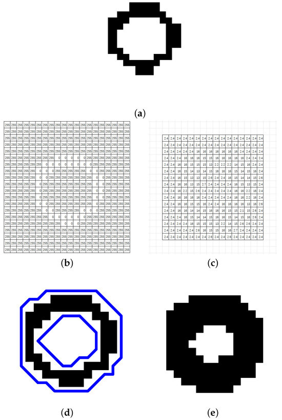 After determining that the ice-covered image had multifractal features, we next used the local Hurst exponents to detect and segment the ice-covered areas in the image. To visually demonstrate the operation process of our algorithm, we first used a synthesized image with a size of for illustration. The original synthesized image is shown in Figure 10a, and the corresponding pixel values are shown in Figure 10b. We utilized a sliding window to calculate the local Hurst value of the image, resulting in a pixel image, as shown in Figure 10c. We arranged the feature values in Figure 10c in ascending order and set them as an arithmetic sequence with . We also set and defined the feature values located in this interval as 0 and 255 otherwise. Then, the newly obtained matrix was point-multiplied with the original image to obtain a new matrix, which was the segmented image. We present the contour segmentation state image and segmentation results in Figure 10e.