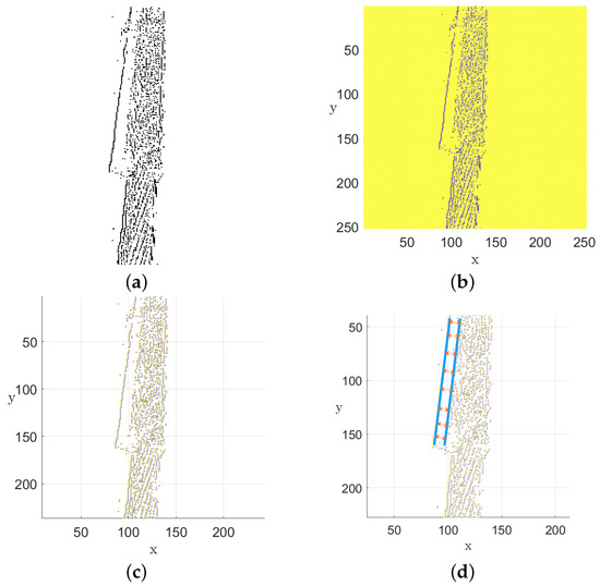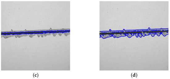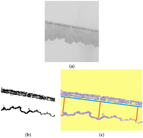 Using the characteristics of the algorithm proposed in this study, we were able to calculate the ice thickness in different images of icing at the same camera position. Taking the camera perspective of the icing image in Figure 12a as an example, we show the segmentation results in Figure 12d on a grid, as shown in Figure 13. Figure 13a indicates the segmented grayscale image result. In Figure 13b, we display the segmentation results when processed using a two-dimensional grid, and in Figure 13c, we enlarge the details on the grid. We denote the distance between the left segmentation edge and the right segmentation edge in Figure 13d as T (see Figure 13d) and the distance of the manually measured icing edge as K. Then, we define as the icing thickness coefficient.