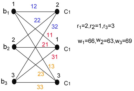 This cryptographic algorithm uses a complete bipartite graph to encode plain text P of length n. The plain text characters are first converted to numerical values by using the Pythagorean table (Table 2) and vertex and edge labeling. To represent each character, a bipartite graph is created with one vertex representing the character and n vertices in the other set. Vertex and edge labels are assigned based on the character’s numerical value and graph positions. The edge weights are used to construct a matrix, which is then multiplied by a symmetric key matrix to yield a new matrix. The final encrypted message is a sequence derived from the remainders of the matrix when divided by . Decryption involves reversing these steps to recover the original plain text using two symmetric keys and solving linear equations.