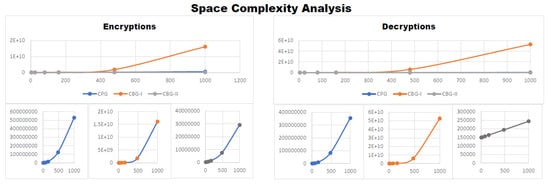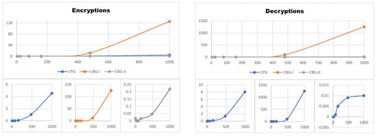 For CPG encryption, we observe the growth of execution time with input size. Based on the data (Table 5) and corresponding Figure 4, the execution time seems to grow faster than linearly but not as fast as quadratically. Hence, the complexity lies between linear and quadratic, potentially or even higher depending on the particular implementation. The major time consuming loop is at lines 10–14 of Algorithm 1 as it contains two FOR loops and four IF–THEN statements. Similar considerations determine the complexity of CBG-I (Algorithm 3) to be of order and CBG-II (Algorithm 5) of order . While comparing the decryption times [3], CBG-I decryption has the most time-expensive statement at lines 4–10 of Algorithm 4, as it comprises three assignments and one IF–THEN statement, which amount to a time complexity of order . Comparatively speaking, CBG-I’s decryption is most expensive followed by CPG of order and CBG-II of order . Table 6 summarizes the whole discussion.
