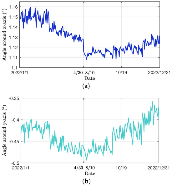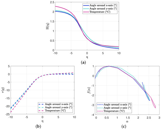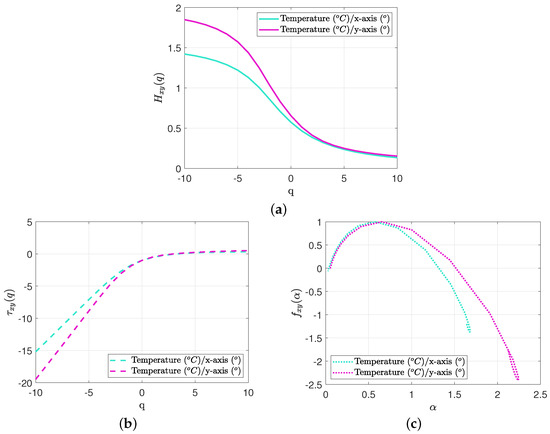 Next, we use MF-DCCA to explore the cross-correlation characteristics between the tilt-angle time series and temperature time series. We depict the generalized Hurst exponent, Renyi exponent, and multifractal spectrum between the tilt angle time series and temperature time series in Figure 7. Figure 7a shows that both values are less than , suggesting that both the time series of x-axis tilt angle and y-axis tilt angle have a negative persistence of cross-correlations with temperature time series. We also observe that the of “Temperature (°C)/y-axis (°)” is larger than that of the time-series pair “Temperature (°C)/x-axis (°)”, which implies a greater cross-correlations of multifractality between temperature and y-axis tilt angle time series. Figure 7b,c can also support this point. The curves in Figure 7c is asymmetrically upconvex and skewed towards the right, which shows that the sequence possesses multiple fractal features.