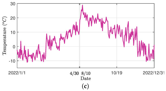 The collected data also include internal temperature data of the inclination sensor device. The internal temperature of the inclination sensor device reflects the air temperature in the monitoring area. The data collection area is located in Jilin Province, China. The period covers from 1 January 2022 to 31 December 2022. Due to our main investigation being into the influence of low temperature on the inclination of transmission towers, we removed data from the high temperature period between 1 May 2022 and 9 August 2022, and used 261 pieces of data for analysis. The time series of the tilt angle with respect to the x- and y-axes and the time series of temperature are shown in Figure 2. It can be seen from the collected data that the three sets of data have a certain symmetry, and all reach the maximum value near the central axis. We use the skewness function to calculate the skewness of the data. When the absolute value of skewness is less than 0.5, we consider the data to be approximately symmetric. Upon testing, the skewness of all three datasets was found to be less than 0.2, which can be used as evidence to demonstrate that the data are roughly symmetric.