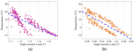 The first-order linear fitting between the temperature data and (a) x-axis tilt angle data, and (b) y-axis tilt angle data. A color version of the figure is available in the web version of the article.