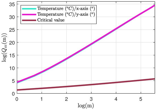 where m is the degree of freedom, and n is the length of the time series x and y. is approximately distributed with degree of freedom m. Here, we set critical value for distribution at a level of significance. In Figure 4, we observe that of both time-series pairs exceed the critical value, indicating significant cross-correlations between the tilt angles and temperature time series.