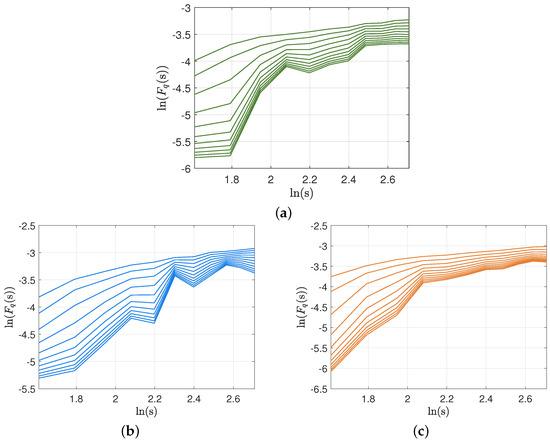 Next, before conducting MF-DCCA, we perform multifractal detrend fluctuation analysis on the three sequences to check for the presence of multifractal characteristics, respectively. Based on the characteristics of the three sequences in Figure 2, we use the logarithmic sequence (i.e., ) as the original sequences. In addition, to avoid computational errors, we first regularize the values of the original data in the interval , which does not change the trend of the sequences or the correlation between sequences. The first-order detrending polynomial is selected to carry out the analysis of the MF-DFA, . In addition, the time scale s varies from 5 to 15. The fluctuation functions plots between and are shown in Figure 5. We see that the fluctuation values increase as the segments increase, and the slope decreases as q increases, showing that multifractal properties exist in all the three time series. In addition, compared to large segment sizes, fluctuations are more pronounced at small segment sizes.