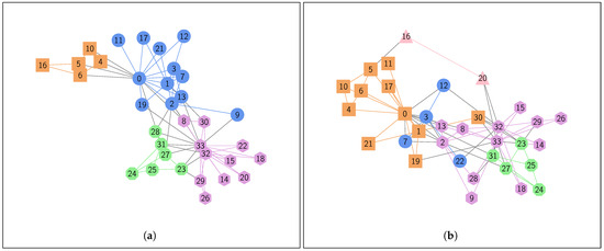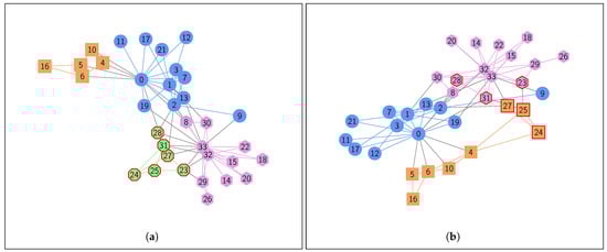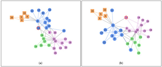 An illustrative example for a target community attack on the Karate network [51] is depicted in Figure 3. The community structure identified with the Louvain algorithm on the original network consists of four communities. Assume that the community whose members are shown as octagons and bordered in red is targeted, that is, target community members are . Considering that the update budget is 4 and the following updates are applied to the graph (deleting edges and , and adding edges and ), the community detection result on the updated network is obtained, as shown on the right, pointing out [6] (i) its members are evenly distributed in two communities, (ii) its members are better ‘hidden’ within the larger communities, and (iii) all its members are reachable from one another.
