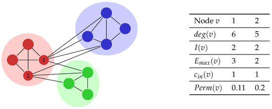 which is based on three factors: (1) internal pull , the internal connections of v inside its own community; (2) maximum external pull , the maximum connections of v to its neighboring communities; and (3) v’s internal clustering coefficient , the fraction of the actual and possible number of links among the internal neighbors of v. The permanence of a node increases if its internal pull is greater than its external pull or its internal neighbors are densely connected. Figure 4 illustrates a toy example of the calculation of the permanence of two nodes. The permanence of a network G is calculated as . Mittal et al. propose NEURAL, a permanence-based deception method that aims to reduce the network permanence to hide a target community C. NEURAL is a greedy strategy that maximizes the permanence loss by choosing the edge update giving the highest at every iteration. NEURAL also allows only intra-community edge deletions and inter-community edge additions. The work [59] then adapts the permanence formula to operate on weighted networks and offers the PERMDEC algorithm using the permanence loss.