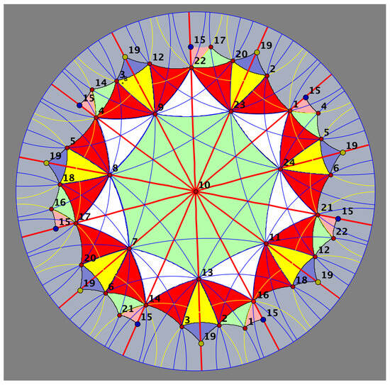 Felix Klein’s regular map of type has 24 vertices, 84 edges, and 56 triangles. We see a seven-fold combinatorial symmetry in this picture, and a rotation around a vertex. The index 8 denotes the length of the Petrie polygon that can be seen in the next picture in yellow.