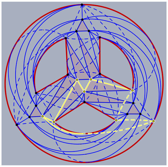The regular Leonardo Polyhedron of Coxeter’s regular map (see [19]) was based on a corresponding 2-manifold in . For an attempt to explain a corresponding embedding via a Schlegel diagram, I have used the following picture in Figure 5. It shows 14 truncated cubes that were adjacent to a further truncated cube C in dimension 4. When we rotate these 14 cubes by using their common 2-faces of C as hinges so that they all lie in the hyperplane of the cube C, we obtain the model in Figure 5, left part. The video https://youtu.be/AailDBdIPVY (accessed on 21 November 2023) shows the corresponding projection of the Schlegel diagram in which the 14 truncated cubes are glued at the central truncated cube. The picture on the right contains an image from the video.