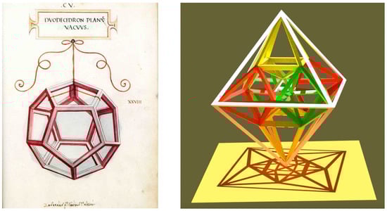 We have six spatial polyhedral realizations of regular maps with at least the rotational symmetry of one of the Platonic solids. These have been named regular Leonardo polyhedra. The reason for this name is shown in Figure 4. Here, we see Leonardo da Vinci’s drawing in which he has replaced the edges of the dodecahedron with struts. This was a first polyhedron with a genus g, . When you do the opposite and you replace the struts of the polyhedron on the right picture with edges, you obtain the Schlegel digram of the 24-cell in dimension 4 that Alicia Boole Stott found in 1880 when she was 18. You can see this model rotating in a YouTube video at https://www.youtube.com/watch?v=3n_hyMpbNL8 (accessed on 8 April 2024).