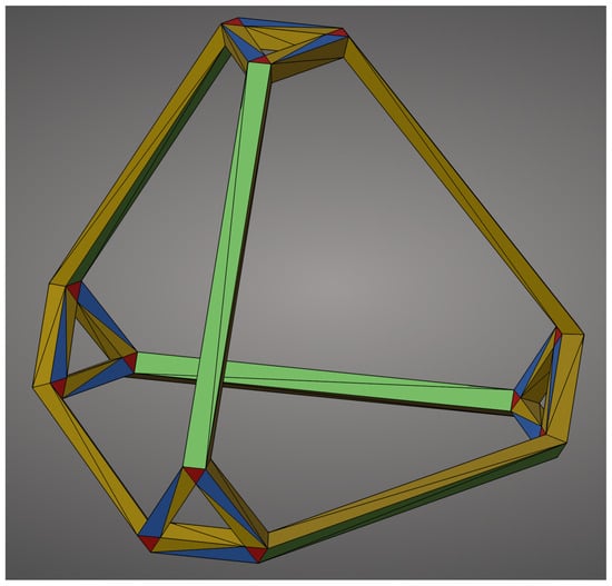 The last and most involved example of a spatial polyhedral realization of a regular map is based on the second example of the infinite list of regular maps of type of Hurwitz. A symmetric description of this regular map can be seen in Figure 7. A polyhedral realization model was made by J. Bokowski and M. Cuntz [23]. You can see this model in two YouTube videos: https://www.youtube.com/watch?v=4Bh_6Zl9ILc (accessed on 20 June 2020). https://www.youtube.com/watch?v=VhmtQ9zhF8Q&t=89s (accessed on 2 June 2020).