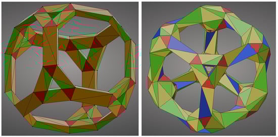 The example with a tetrahedral symmetry in Figure 10 has 72 vertices, 252 edges, and 168 triangles.
