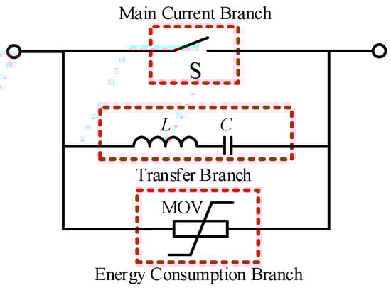 The structure of the mechanical DC circuit breaker is illustrated in Figure 2. Under normal operating conditions, the working current flows through the main current branch via the mechanical switch S, resulting in very low static losses. However, when a fault occurs on the DC side, disconnecting the switch causes an arc to form, which is difficult to extinguish due to the absence of a natural zero-crossing point in the short-circuit current. To address this challenge, an LC self-excited oscillation structure is integrated into the mechanical DC circuit breaker, building on the design of the AC circuit breaker. The reverse current generated by this structure counters the fault current, creating a zero-crossing point. At this moment, the arc extinguishing process is initiated, and the current is subsequently transferred to the energy dissipation branch. The lightning arrester then absorbs the fault energy, effectively eliminating the fault.