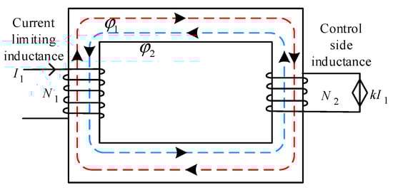 In the figure, N1 represents the current-limiting side inductance, while N2 denotes the control side inductance. The red dashed line indicates the direction of the flux generated through the left winding, that is, the magnetic field generated by the current on the input side, bypassing the core to the control side. The blue dashed line indicates the direction of the flux generated through the right winding, that is, the magnetic field generated by the current on the control side, bypassing the core and flowing to the input side. The saturation of the current-limiting inductance occurs due to the internal magnetic flux saturation within N1. This structure mitigates the rising magnetic flux in N1 by introducing reverse magnetic flux through N2 via a secondary controlled source, thereby achieving a desaturation effect.