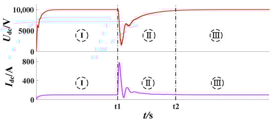 Phase I of the DC system is in normal operation. When a single pole grounding fault occurs at time t1, it enters phase II. It is in the transient phase. It can be observed from Figure 6 that the DC voltage sag occurs at time t1. At the same time, the DC line flows through the short-circuit transient current, which will impact the thermal stability and dynamic stability of the electrical equipment. The grounding impedance is set as 4 Ω in the simulation process. Therefore, the amplitude of the transient current is small, only eight times that of the rated operation. Due to the function of the converter control system, the system enters the third stage, a stable state, at t2, and the DC voltage and current are restored to the rated value.